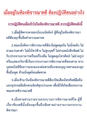 2.ขณะนั่งฟังการพิจารณาคดีต้องไม่พูดคุยกัน ไม่นั่งหลับ ไม่