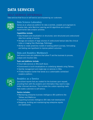 • Cloud data services on Microsoft Azure • Environment to build visualizations on on on underlying datasets using Tableau • Identity management and single-sign on services in in Okta • IT-Data Analytics Center that serves as a a a a a a a a customizable centralized