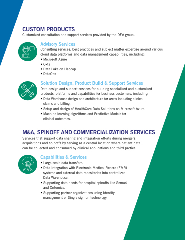 • Data Warehouse design and architecture for areas including clinical claims and billing • Setup and design of of HealthCare Data Solutions on on Microsoft Azure • Machine learning algorithms and Predictive Models for clinical outcomes M&A SPINOFF AND COMMERCIALIZATION SERVICES