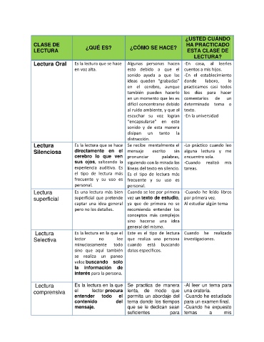 Lectura           Es la lectura en la que   Se  practica  de  manera  -Al  leer  un  tema  para