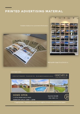 PRINTED ADVERTISING MATERIAL Reception Display at our prominent office location. High quality 4 page Glossy Brochures. Home Open Invites If appropriate, invitations to your local neighbourhood to attend Home Opens