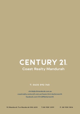 T: 0435 092 740 chrisb@c21mandurah.com.au coastrealty.century21.com.au/team/chris-butterworth facebook.com/ChrisPButterworth 92 Mandurah Tce Mandurah WA 6210 T:08 9581 3399 F: 08 9581 5816