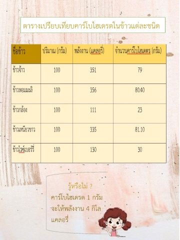 ตารางเปรียบเทียบคาร์โบไฮเดรตในข้าวแต่ละชนิด