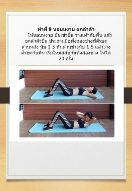 ท่าที่ 9 นอนหงาย ยกล าตัว ให ้นอนหงาย ชันเข่าขึ้น วางเท ้ากับพื้น แล ้ว ยกล าตัวขึ้น ประสานมือทั้งสองข ้างที่ศีรษะ ด ้านหลัง นับ 1-5 หันด ้านข ้างนับ 1-5 แล ้ววาง ศีรษะกับพื้น เริ่มใหม่สลับกันทั้งสองข ้าง ให ้ได ้ 20 ครั้ง