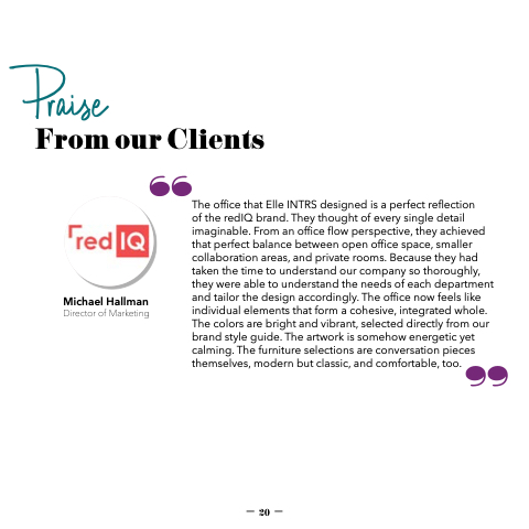 of of of of the the redIQ brand They thought of of of of every single detail imaginable From an an an office office flow perspective they achieved that perfect balance between open office office space smaller collaboration areas and and private rooms Because they had taken the the the the time to to understand understand our company so thoroughly they were able to to understand understand the the the the needs of of each department and and tailor the the the design accordingly The office now feels like individual elements that form a a a a a a a a a a cohesive integrated whole The The colors are bright and and vibrant selected directly from our brand style guide The The The artwork is somehow energetic yet calming The The furniture selections are conversation pieces themselves modern but classic and comfortable too 20