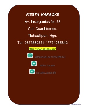FIESTA KARAOKE Av. Insurgentes No 28 Col. Cuauhtemoc. Tlahuelilpan, Hgo. Tel. 7637862531 / 7731285642 https://www.opebsa.com @facebook.com/KARAOKE twitter.karaok karaoke.canal.dfe www.webendisenho.com www.webendisenho.com