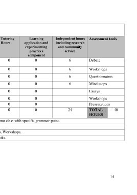 Class Hours/ Teaching Tutoring Learning Independent hours Assessment tools
