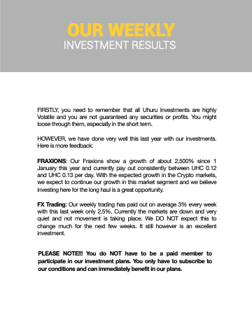 FRAXIONS: Our Fraxions show a growth of about 2,500% since 1 January this year and currently pay out consistently between UHC 0.12 and UHC 0.13 per day. With the expected growth in the Crypto markets, we expect to continue our growth in this market segment and we believe investing here for the long haul is a great opportunity.