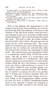 NEXT to the elephant, the hippopotamus is the largest of quadrupeds, being sometimes above seven teen feet long from the extremity of the snout to the insertion of the tail, about sixteen round the body; and although its legs are so short that its belly nearly touches the ground, yet it stands not less than seven et high. The head is large, the muzzle swollen, and surrounded with bristles; the eyes and ears are small, and the mouth extremely wide. The canine teeth are of enormous size, and of texture like ivory ; they are ur in number, and protrude like tusks. On each ot there are ur toes, terminated by small hoofs. The stomach bears some resemblance to that of a ruminating animal, being divided into several sacks. The skin is slack, of a mouse-colour, and almost impenetrable to a musket-ball. This huge animal is gregarious, and nocturnal in its land habits, lurking during t day in the swamps, or among the reeds, and during night wandering in search of its od, which consists of roots, succulent grasses, rice, or whatever grain it can nd growing. The devasta tion it commits is immense, not only in the quantity that it devours, but in what it tramples down and destroys. But, rtunately, these ravages do not ex tend widely, as the hippopotamus seldom ventures r om the river, to which it immediately betakes itself on the approach of danger, and, plunging in head remost, walks securely on the bottom, only