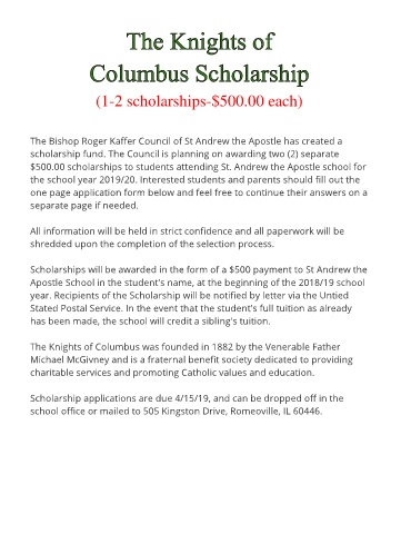 $500.00 scholarships to students attending St. Andrew the Apostle school for