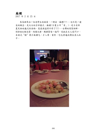 麻糬 2017 年 2 月 25 日 來高雄參加一位老學生的婚宴,一開桌,麻糬!!!~~~這不是一道 菜的概念,是大大的吉祥儀式。麻糬(古書上叫「粢」),是古老華 夏民族的儀式性食物,意義深遠得不得了!!!~~~台灣的客家族群, 保持的比較完整,結婚大禮,親朋賀客一進門,先就在主人家門口, 自助式〝撥〞幾片麻糬吃,才入席。當然,它也普遍流傳在漢人社 中。 202
