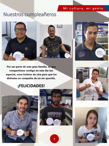 M i c u l t u r a , m i g e n t e Nuestros cumpleañeros Por ser parte de esta gran familia, es que compartimos contigo en este día tan especial, unos boletos de cine para que los disfrutes en compañía de un ser querido. ¡FELICIDADES! 8
