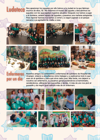 Nos apasionan los juguetes por ello fuimos a la ciudad en la que fabrican muchos de ellos, Ibi. Allí visitamos el museo del juguete y descubrimos los juguetes con los que jugaban nuestros abuelos. Después nos fuimos a jugar a la ludoteca, estaba repleta de juguetes y pasamos una mañana estupenda. Para reponer fuerzas nos fuimos a comer y a seguir jugando a un parque cercano y ya agotados de vuelta a casa.