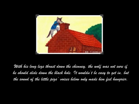 With his long legs thrust down the chimney, the wolf was not sure if he should slide down the black hole. It wouldn’t be easy to get in, but the sound of the little pigs’ voices below only made him feel hungrier.