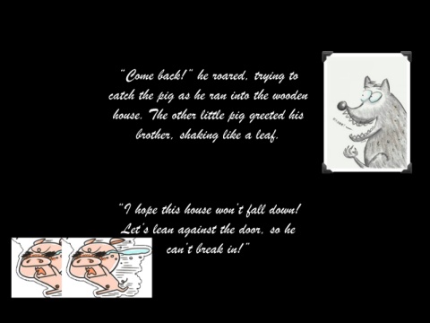 “Come back!” he roared, trying to catch the pig as he ran into the wooden house. The other little pig greeted his brother, shaking like a leaf. “I hope this house won’t fall down! Let’s lean against the door, so he can’t break in!”