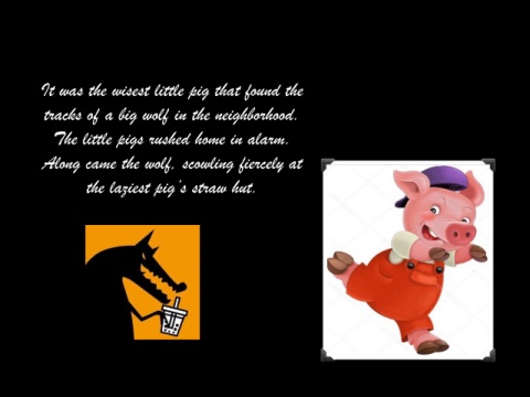 It was the wisest little pig that found the tracks of a big wolf in the neighborhood. The little pigs rushed home in alarm. Along came the wolf, scowling fiercely at the laziest pig’s straw hut.
