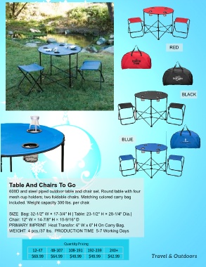 mesh cup holders; two foldable chairs. Matching colored carry bag