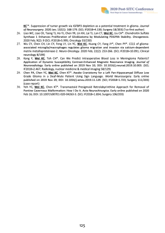 28. Kang Y, Wei KC, Toh CH*. Can We Predict Intraoperative Blood Loss in Meningioma Patients? Application of Dynamic Susceptibility Contrast-Enhanced Magnetic Resonance Imaging. Journal of Neuroradiology. Early online published on 2019 Nov 10; DOI: 10.1016/j.neurad.2019.10.003. (SCI; IF2018=2.467; Radiology, nuclear medicine & medical imaging 58/129)