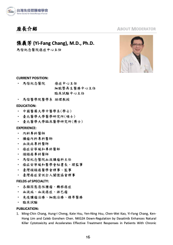 座長介紹 ABOUT MODERATOR 張義芳 (Yi-Fang Chang), M.D., Ph.D.