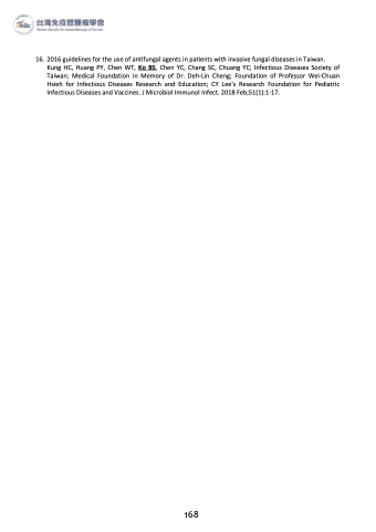 16. 2016 guidelines for the use of antifungal agents in patients with invasive fungal diseases in Taiwan. Kung HC, Huang PY, Chen WT, Ko BS, Chen YC, Chang SC, Chuang YC; Infectious Diseases Society of Taiwan; Medical Foundation in Memory of Dr. Deh-Lin Cheng; Foundation of Professor Wei-Chuan Hsieh for Infectious Diseases Research and Education; CY Lee's Research Foundation for Pediatric Infectious Diseases and Vaccines. J Microbiol Immunol Infect. 2018 Feb;51(1):1-17.