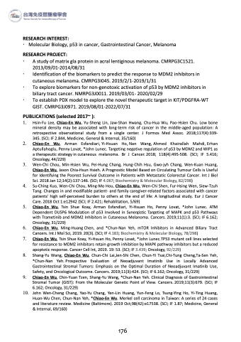 9. Chiao‐En Wu, Chin-Yuan Tzen, Shang-Yu Wang, *Chun-Nan Yeh. Clinical Diagnosis of Gastrointestinal Stromal Tumor (GIST): From the Molecular Genetic Point of View. Cancers. 2019;11(3):679. (SCI; IF
