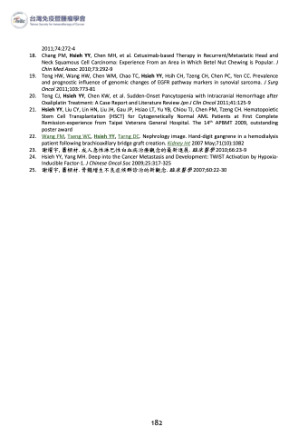 21. Hsieh YY, Liu CY, Lin HN, Liu JH, Gau JP, Hsiao LT, Yu YB, Chiou TJ, Chen PM, Tzeng CH. Hematopoietic Stem Cell Transplantation (HSCT) for Cytogenetically Normal AML Patients at First Complete Remission‐experience from Taipei Veterans General Hospital. The 14th APBMT 2009, outstanding