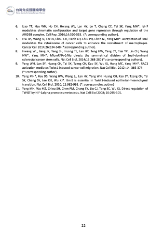 7. Hsu DS, Wang SJ, Tai SK, Chou CH, Hsieh CH, Chiu PH, Chen NJ, Yang MH*. Acetylation of Snail modulates the cytokinome of cancer cells to enhance the recruitment of macrophages. Cancer Cell 2014;26:534-548 (*:corresponding author).