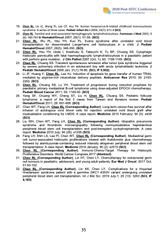 21. Chen RL, Wu PL, Hsu YH, Kuo PL. Evans syndrome after unrelated cord blood transplantation for disseminated Langerhans cell histiocytosis in a child. J Pediatr Hematol/Oncol 2007; 29(5): 348-350. (SCI)