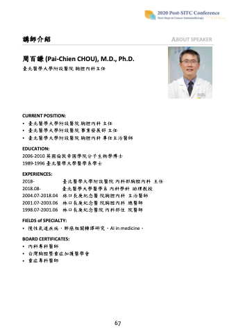 講師介紹 ABOUT SPEAKER 周百謙 (Pai‐Chien CHOU), M.D., Ph.D.