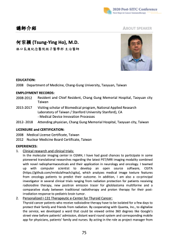 In the molecular imaging center in CGMH, I have had good chances to participate in some pioneered translational researches regarding the latest PET/MRI imaging modality combined with novel radiopharmaceuticals and their application in neurology and oncology. I teamed up with computer scientist to develop an open source software, CGITA (https://github.com/mridulafmach/cgita), which analyzes medical image texture features from oncology patients to predict their outcome. In addition, I am also a co-principal investigator in several clinical trials ranging from radiation protection for patients receiving radioiodine therapy, new positron emission tracer for glioblastoma multiforme and a comparative study between traditional radiotherapy and proton therapy for their post- irradiation response to pediatric brain tumor.