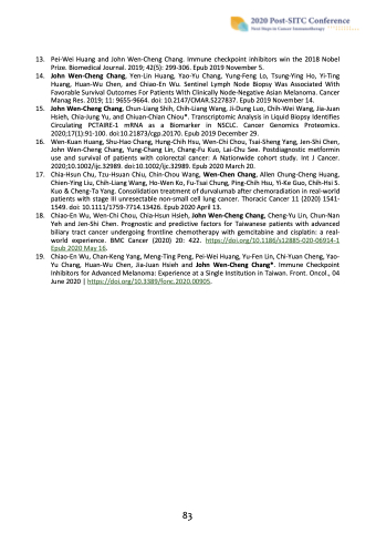 13. Pei‐Wei Huang and John Wen‐Cheng Chang. Immune checkpoint inhibitors win the 2018 Nobel Prize. Biomedical Journal. 2019; 42(5): 299‐306. Epub 2019 November 5.