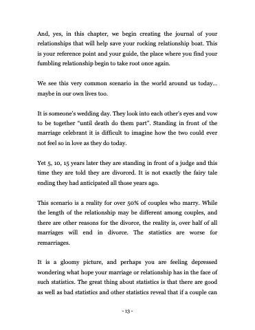 And, yes, in this chapter, we begin creating the journal of your relationships that will help save your rocking relationship boat. This is your reference point and your guide, the place where you find your fumbling relationship begin to take root once again.