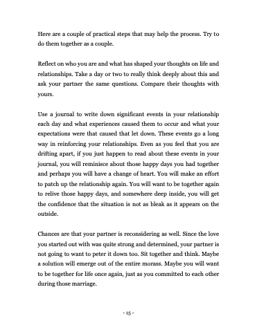 Use a journal to write down significant events in your relationship each day and what experiences caused them to occur and what your expectations were that caused that let down. These events go a long way in reinforcing your relationships. Even as you feel that you are drifting apart, if you just happen to read about these events in your journal, you will reminisce about those happy days you had together and perhaps you will have a change of heart. You will make an effort to patch up the relationship again. You will want to be together again to relive those happy days, and somewhere deep inside, you will get the confidence that the situation is not as bleak as it appears on the outside.