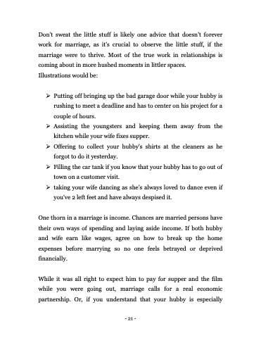 One thorn in a marriage is income. Chances are married persons have their own ways of spending and laying aside income. If both hubby and wife earn like wages, agree on how to break up the home expenses before marrying so no one feels betrayed or deprived financially.
