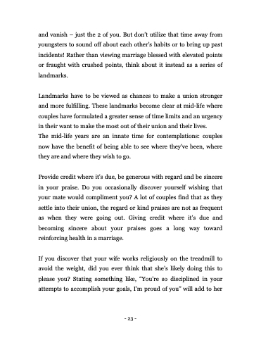 Landmarks have to be viewed as chances to make a union stronger and more fulfilling. These landmarks become clear at mid-life where couples have formulated a greater sense of time limits and an urgency in their want to make the most out of their union and their lives.