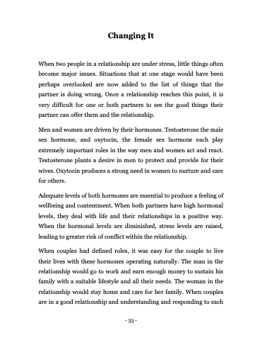 When couples had defined roles, it was easy for the couple to live their lives with these hormones operating naturally. The man in the relationship would go to work and earn enough money to sustain his family with a suitable lifestyle and all their needs. The woman in the relationship would stay home and care for her family. When couples are in a good relationship and understanding and responding to each