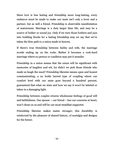 Since love is less lasting and friendship more long-lasting, every endeavor must be made to make our mate isn't only a lover and a partner, but as well a friend. Friendship is observable manifestation of matureness. Marriage is a duty larger than life, and may be a source of bother or sound joy. Only if we turn those bothers and joys into building blocks for a lasting friendship may we say that we’ve taken the firm path to a union made in heaven.