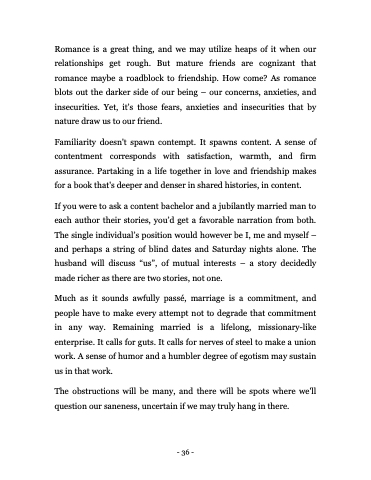 Romance is a great thing, and we may utilize heaps of it when our relationships get rough. But mature friends are cognizant that romance maybe a roadblock to friendship. How come? As romance blots out the darker side of our being – our concerns, anxieties, and insecurities. Yet, it’s those fears, anxieties and insecurities that by nature draw us to our friend.