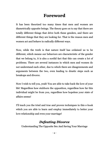 I’ll teach you the tried and true and proven techniques in this e-book which you are able to learn and employ immediately to better your love relationship and even your marriage!