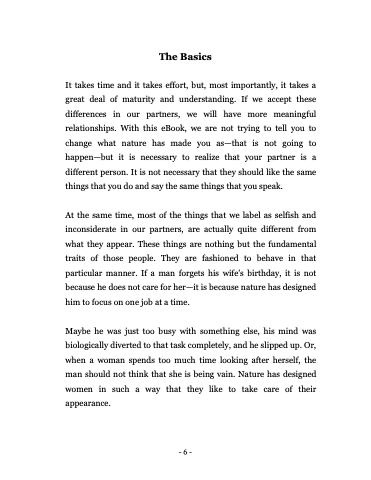 It takes time and it takes effort, but, most importantly, it takes a great deal of maturity and understanding. If we accept these differences in our partners, we will have more meaningful relationships. With this eBook, we are not trying to tell you to change what nature has made you as—that is not going to happen—but it is necessary to realize that your partner is a different person. It is not necessary that they should like the same things that you do and say the same things that you speak.
