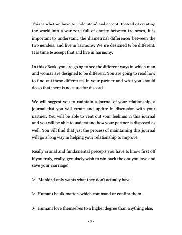 In this eBook, you are going to see the different ways in which man and woman are designed to be different. You are going to read how to find out these differences in your partner and what you should do so that there is no cause for discord.