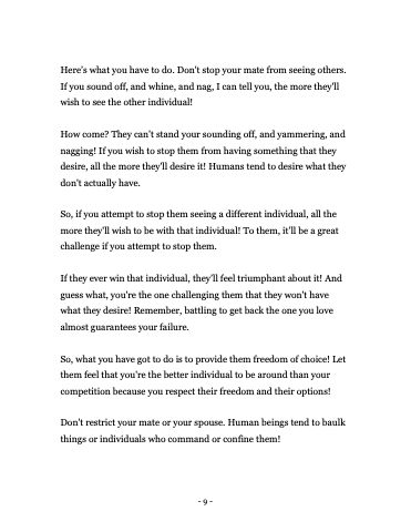 Here’s what you have to do. Don't stop your mate from seeing others. If you sound off, and whine, and nag, I can tell you, the more they'll wish to see the other individual!