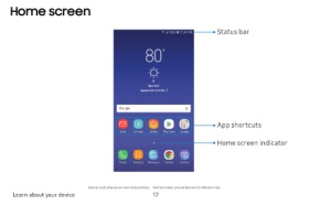 Home screen Status bar App shortcuts Home screen indicator Devices andsoftwareareconstantly evolving—theillustrations youseehereareforreferenceonly. Learn about your device 17