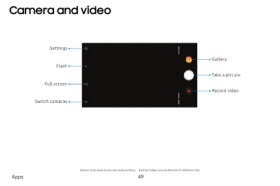 Camera and video Settings Gallery Flash Take a picture Full screen Record video Switch cameras Devices andsoftwareareconstantly evolving—theillustrations youseehereareforreferenceonly. Apps 49