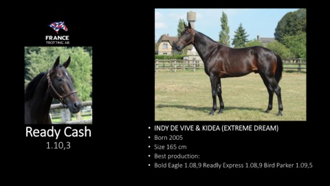 Ready Cash • INDY DE VIVE & KIDEA (EXTREME DREAM) • Born 2005 1.10,3 • Size 165 cm • Best production: • Bold Eagle 1.08,9 Readly Express 1.08,9 Bird Parker 1.09,5