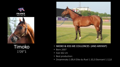 Timoko • IMOKO & KISS ME COULONCES (AND ARIFANT) • Born 2007 1'09"1 • Size 162 cm • Best production: • Dreammoko 1.09,4 Elite du Ruel 1.10,3 Etonnant 1.12,8