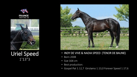 Uriel Speed • INDY DE VIVE & NADIA SPEED (TENOR DE BAUNE) • Born 2008 1'13"3 • Size 164 cm • Best production: • Gospel Pat 1.12,7 Girolamo 1.13,0 Forever Speed 1.17,6