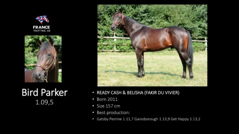 Bird Parker • READY CASH & BELISHA (FAKIR DU VIVIER) • Born 2011 1.09,5 • Size 157 cm • Best production: • Gatsby Perrine 1.11,7 Gainsborough 1.13,9 Get Happy 1.13,2