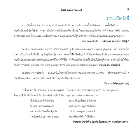 ส าหรับแรงกายแรงใจกับการท างานในสายวิชานี้ ขอบคุณนะครับที่ได้รู้จักกัน หลังจากนี้ถ้าเปิดร้านเดี๋ยวไปอุดหนุนนะครับ”