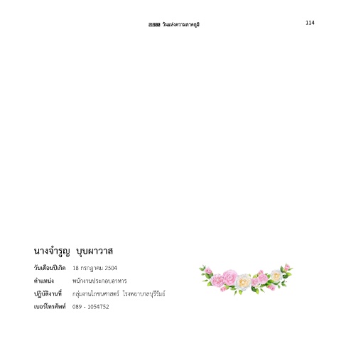 21900 วันแห่งความภาคภูมิ 114 นางจ ารูญ บุบผาวาส วันเดือนปีเกิด 18 กรกฎาคม 2504 ต าแหน่ง พนักงานประกอบอาหาร ปฏิบัติงานที่ กลุ่มงานโภชนศาสตร์ โรงพยาบาลบุรีรัมย์ เบอร์โทรศัพท์ 089 - 1054752